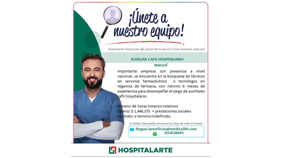 Importante empresa con presencia a nivel nacional, se encuentra en la búsqueda de técnicos en servicios farmacéuticos, con mínimo 6 meses de experiencia para desempeñar el cargo de auxiliares cafh hospitalario.